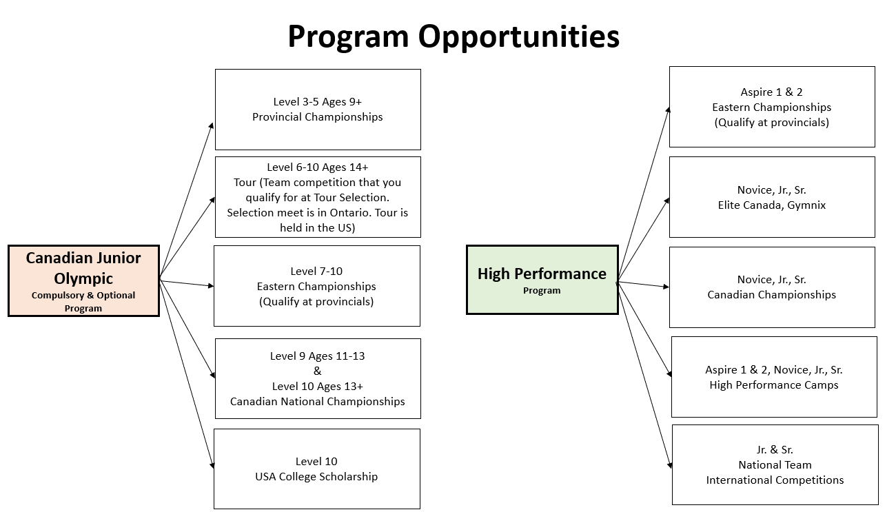 All team programs are 12-months in length with the new season starting in July. The Club is a member of Gymnastics Ontario and follows the technical requirements to compete in the Development Program. Provincial competition begins at 9 years of age with various levels of entry dependent on the gymnast’s mastery of the skill requirements. Competitive age is determined by the birth year age as of Dec 31, of the following year.